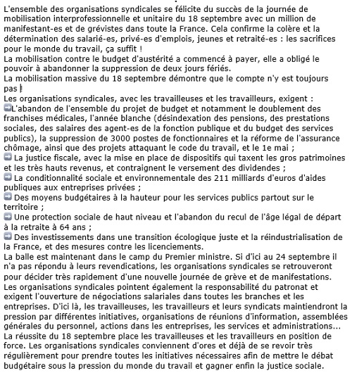 Communiqué commun CFDT, CGT, FO, CFE-CGC, CFCT, UNSA, FSU, Solidaires